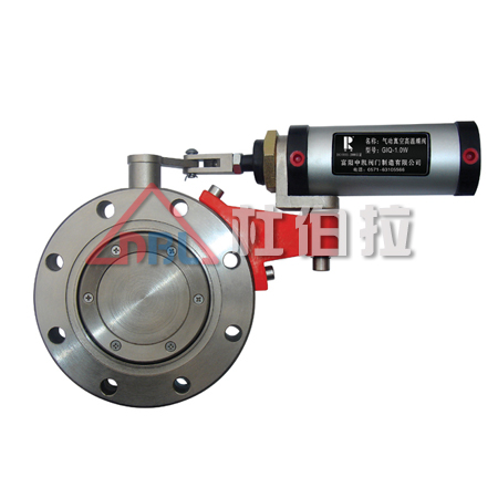 气动高真空蝶阀是由执行机构(气动、电动)与转角型蝶阀体二部份组成,中间由支架相连而成。以GIQ型为例:执行机构是由双气路气缸为 主体,接受二位四通电磁阀控制输出的(0.4~0.6MPa)气源信号压力为动力,通过控制元件改变气流方向,执行气缸驱动蝶阀作启闭运动。
